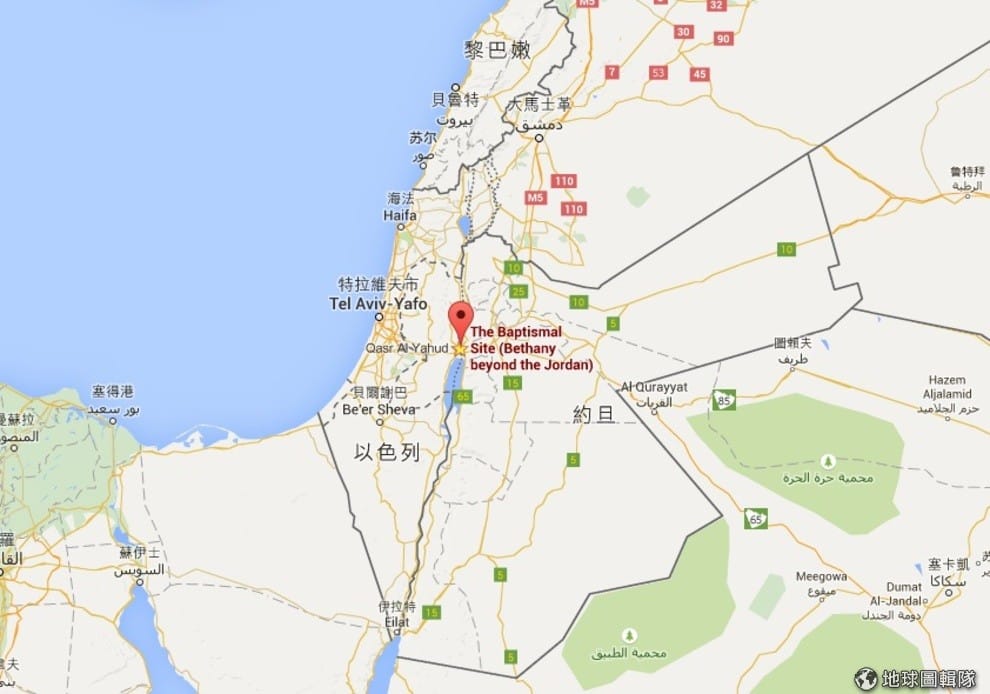 圖中紅點處兩旁為分居約旦河東西岸的受洗地。