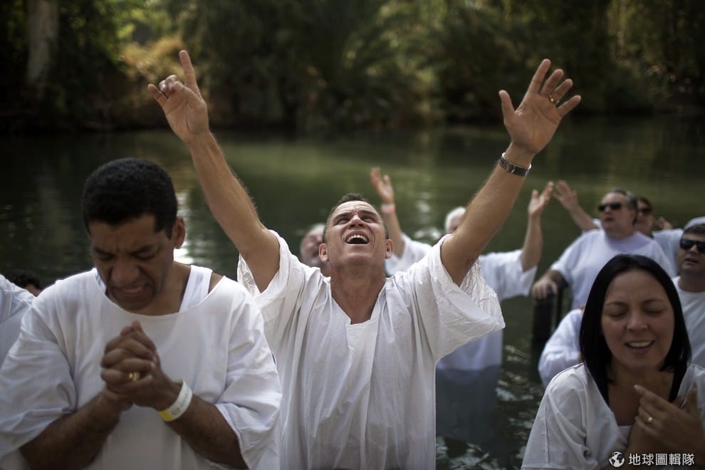 信徒身穿白袍浸在約旦河中,象徵洗滌自己在俗世間的罪惡。