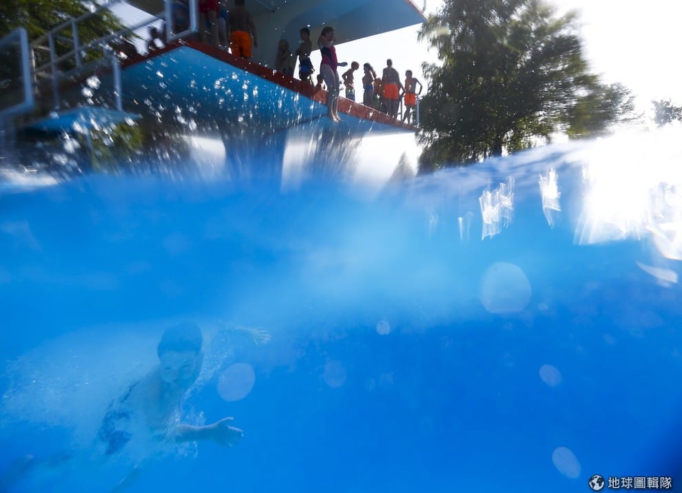 提洛邦(Tirol)的霍爾市內,孩子們在艷陽天下跳進泳池中。夏天熱浪席捲歐洲,法國、英國、比利時、荷蘭以及西德地區通通都感受到這股熱力。