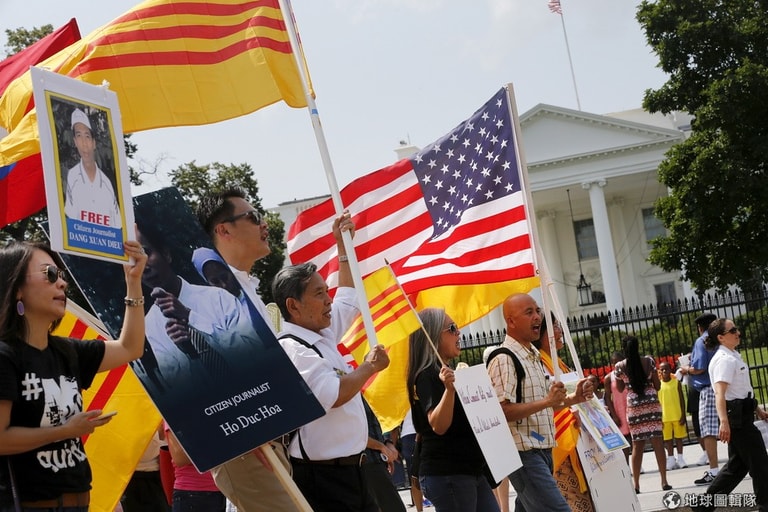 白宮外,擁護人權的抗議民眾高舉美國旗幟,手上拿著政治犯的照片,要求越南政府盡速釋放他們。