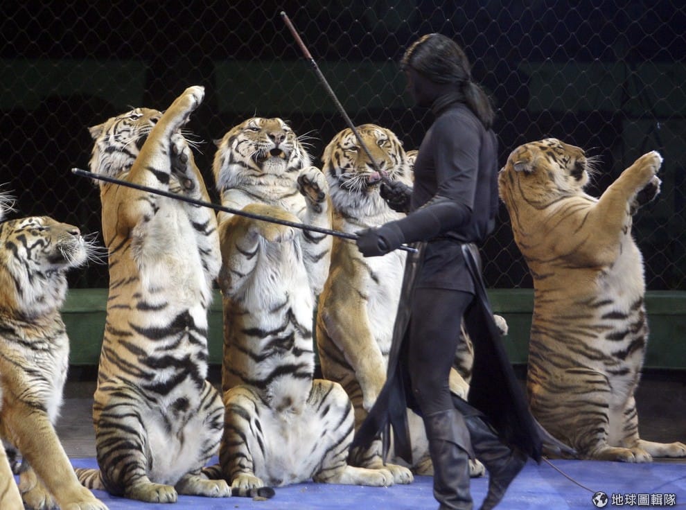 老虎們在觀眾前排成一座金字塔,還跳了火圈,觀眾大喊著:「別拿走動物!」