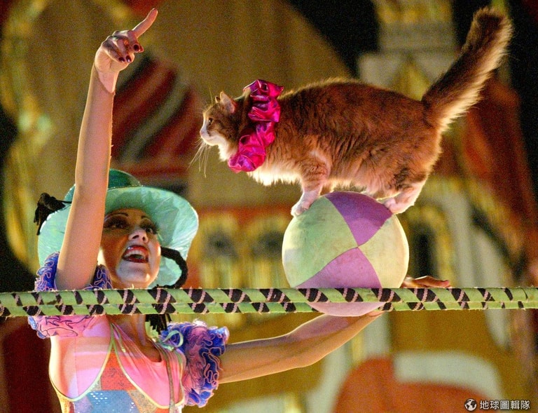 馬戲團表演人員和踩著球的貓咪默契一級棒。