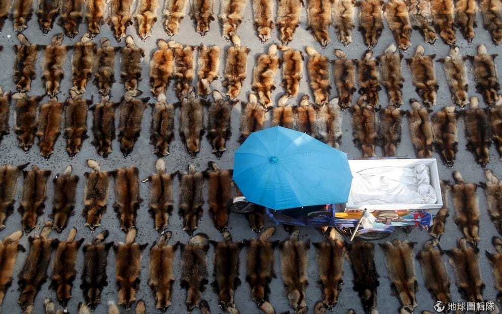 浙江省江西一帶,一位民眾騎著三輪車經過毛皮市場,地上有大片的貉皮擺開。《維基百科》介紹,貉(raccoon dog)生活在山林中,晝伏夜出,以魚蝦和鼠兔為食。是一種珍貴的毛皮獸,現在已開始大規模圈養。在中國,商業上習慣把貉分為南貉和北貉,即以長江為界,長江以南為南貉,長江以北為北貉。