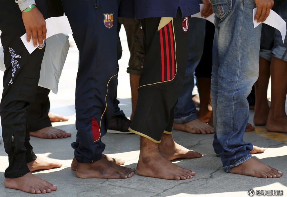 排隊登記身分的移民們全光著腳。15號這天,地中海再度傳出有移民船隻發生翻覆意外,「海外移民援助站」(Migrant Offshore Aid Station, MOAS)協助救援了數百位民眾到西西里島港口。