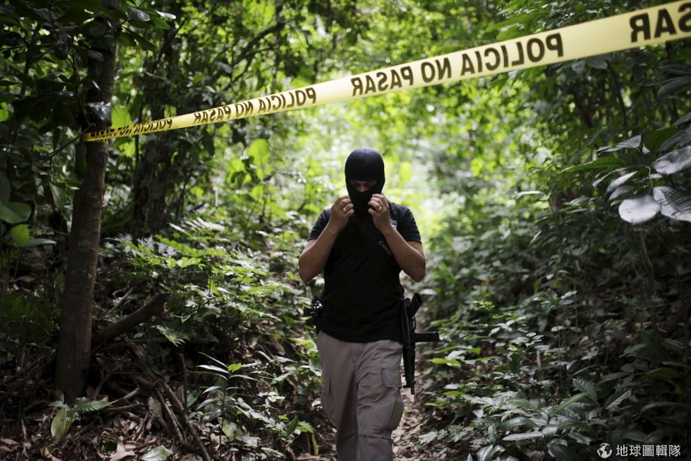 薩國南部的奧洛奎爾塔(Olocuilta)鎮上,一名檢調人員從犯罪現場走出。今年 7月開始,薩國的兇殺案率出現降低趨勢,薩國政府表示會在近日實施新的打擊犯罪策略,當中包括讓法醫團隊能直接在犯罪現場作業等等。