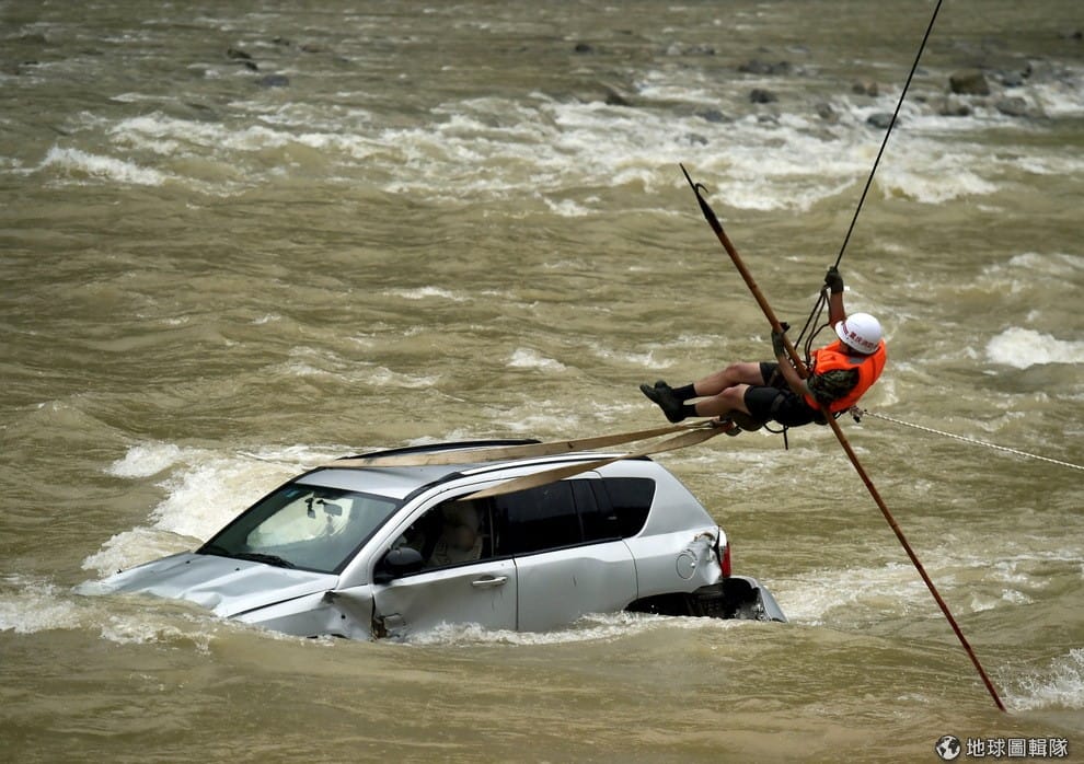 重慶市內,一名救難人員正試著把被暴漲溪流困住的車移走,當地媒體指出,重慶市在這幾天因為大雨影響,出現淹水情況,甚至有 10多輛車被沖進河中。