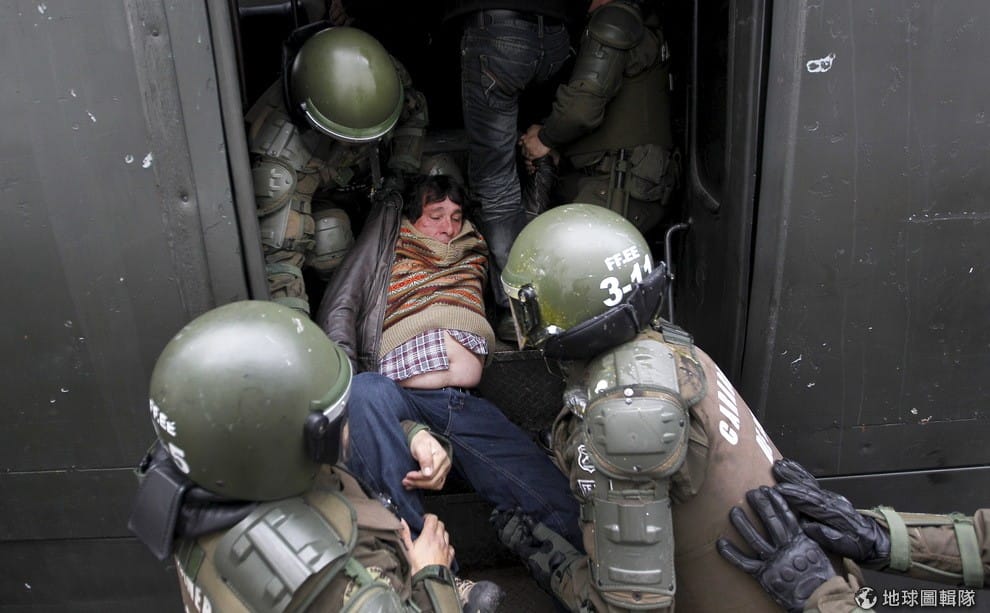 抗議工作權益不夠的港口工人,被警察逮捕並架上車。