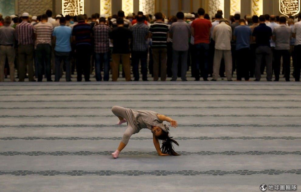 安卡拉的哈姆迪清真寺(Ahmet Hamdi Akseki Mosque)內,小女生在大人們誠心祈禱的時候,在後面玩耍起來。