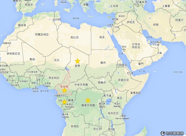 非洲目前有四個國家,禁止民眾戴面紗把臉遮起來,這四個國家分別是喀麥隆、查德、加彭、剛果共和果(圖中星號處)。