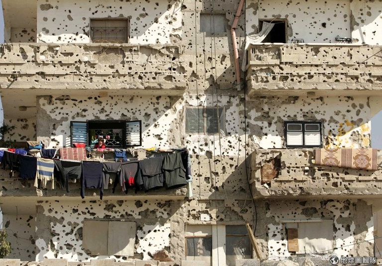 加薩走廊的經濟就像圖中被槍林彈雨攻擊的建築物一樣,非常脆弱。