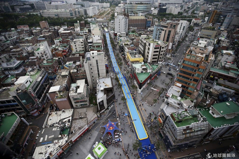 南韓首爾的市區裡,可以看到 350公尺長的滑水道在大城市中央伸展。18-19號是南韓的城市滑水道慶典(City Silde Festa),這兩天他們封鎖了馬路,在街上搭起了長達 350公尺的滑水道,邀請所有人享受夏日清涼。