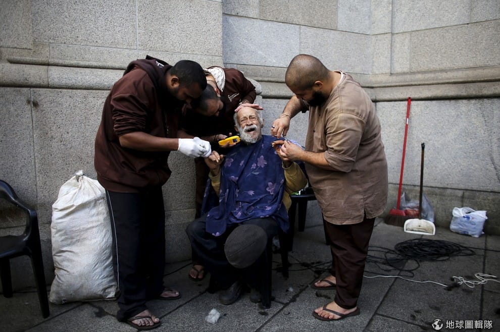 聖保羅市區的教堂前面,「O Caminho方濟會」的成員正在幫一名街友剪頭髮、修指甲。聖保羅是南美洲最大的城市,根據聖保羅市政府估計,城市裡大約有 1.6萬名街友。