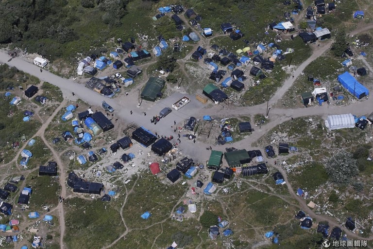 從空中往下看,可以看到法國北部的加萊市(Calais)散布著帳篷和臨時小屋。這些帳篷是難民們暫時居住的地方,大約 3千名難民從貧窮、戰爭、不安定的政治局勢中逃出來,一路逃到加萊市暫住,他們每天都試圖要搭上大卡車或是火車,好前往北方的英國。