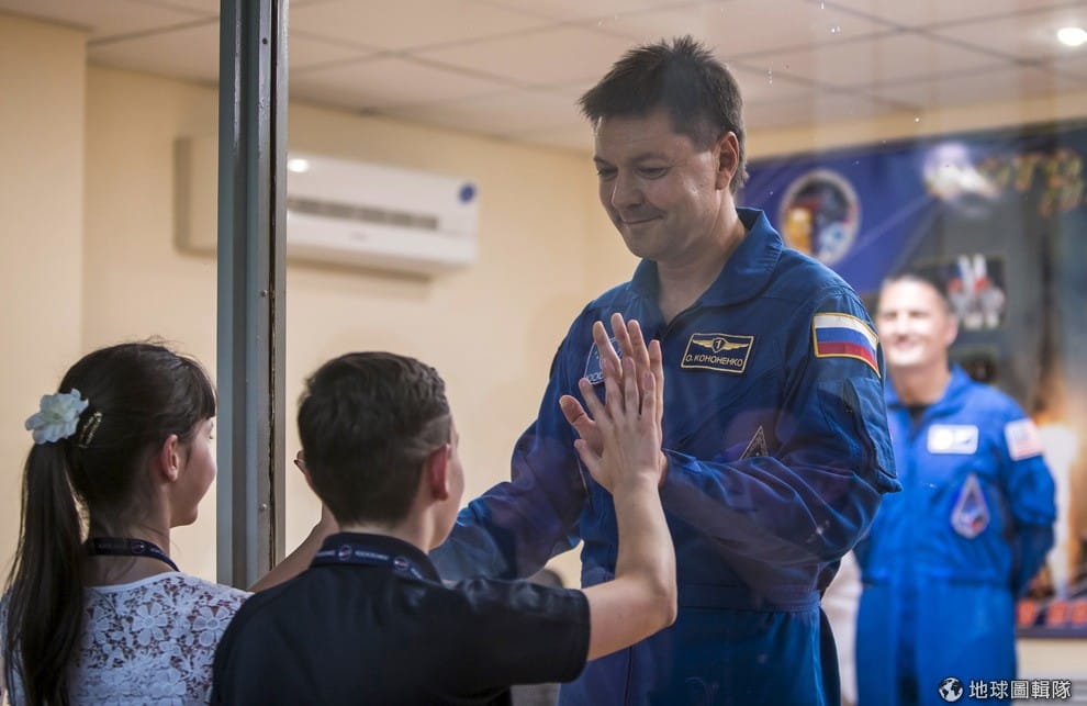 俄籍太空人科諾年科(Oleg Kononenko)站在玻璃後面看著自己的小孩。科諾年科在 23號時,跟NASA的林格倫(Kjell Lindgren)、日本的油井龜美也(Kimiya Yui)兩位太空人搭上俄國的聯合號火箭(Soyuz),飛往國際太空站(ISS)。