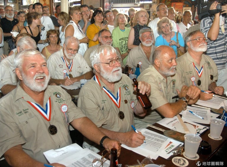 當然,並不是只要長得「穩重」又蓄上大把灰白鬍鬚就好,因為每一位參賽者都是精心打扮前來參賽;有的人會換上打獵裝扮的卡其短褲,還有人不畏爆汗的大熱天,特地穿著高領羊毛衫前來參戰(註:這些都是海明威常見於媒體上的樣子)。