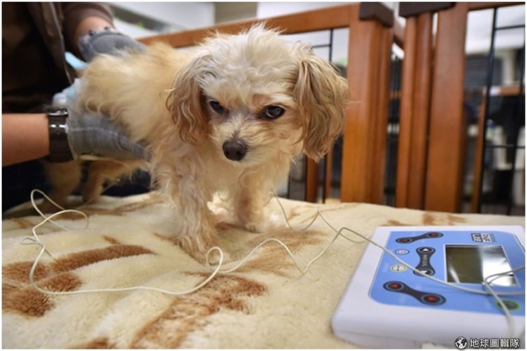 後肢癱瘓的8歲小鈴在Let"s接受低周波按摩。