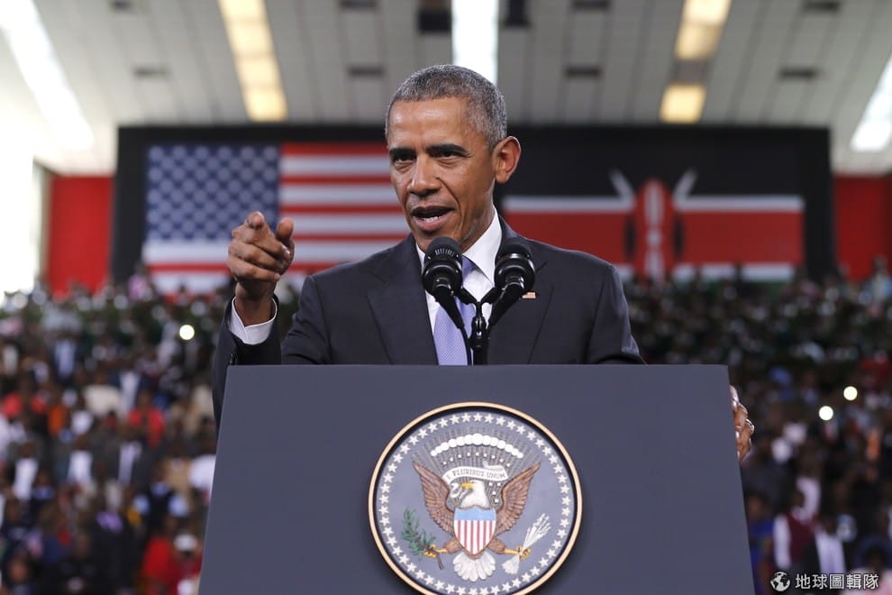 美國總統歐巴馬在大體育館中演講,為這次出訪肯亞畫下完美的句點,背後右手邊的肯亞國旗和美國國旗並排高高掛起。