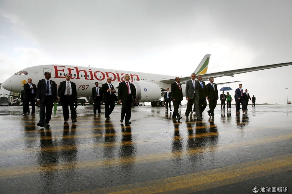 美國總統歐巴馬(機翼下人群左邊第二位,Barack Obama)在衣索比亞國際機場參觀完波音787夢幻客機之後,邊走邊跟衣索比亞航空執行長基布雷馬利安(Tewolde Gebremariam,歐巴馬右手邊人物)、衣索比亞總理戴沙略(Hailemariam Desalegn,歐巴馬左手邊人物)聊天。