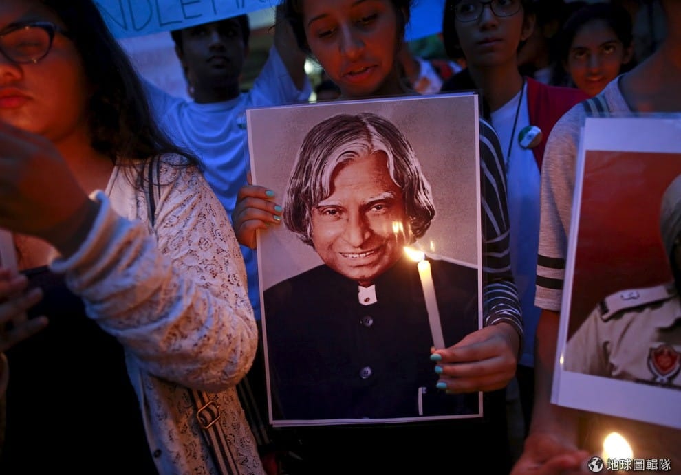 學生手裡拿著印度前總統卡拉姆(A. P. J. Abdul Kalam)的畫像,卡拉姆在 27號時過世,享年 83歲。卡拉姆在世的時候,帶領科研團隊研發出可以攜帶印度核彈頭的導彈,被人尊稱為印度的「導彈之父」。1998年的時候,他因為在核彈試驗中擔任重要角色,強化印度核武的基礎而成為國民英雄。