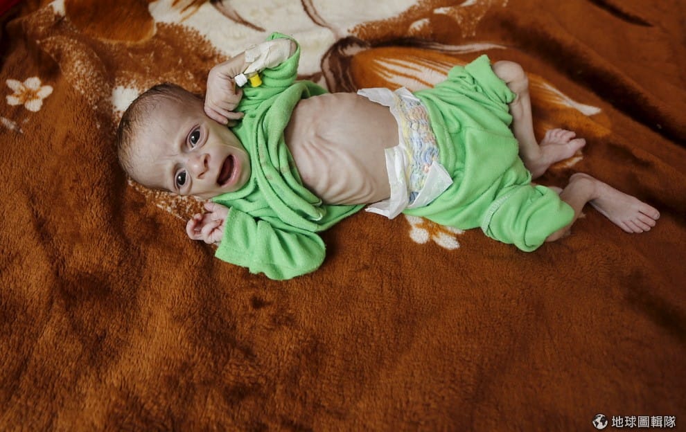 一名營養不良的小孩躺在醫院的床上。葉門的內戰從去年一直打到現在,已經造成 3,500人死亡,聯合國兒童基金會說這 3,500人中包含了 365個孩子。
