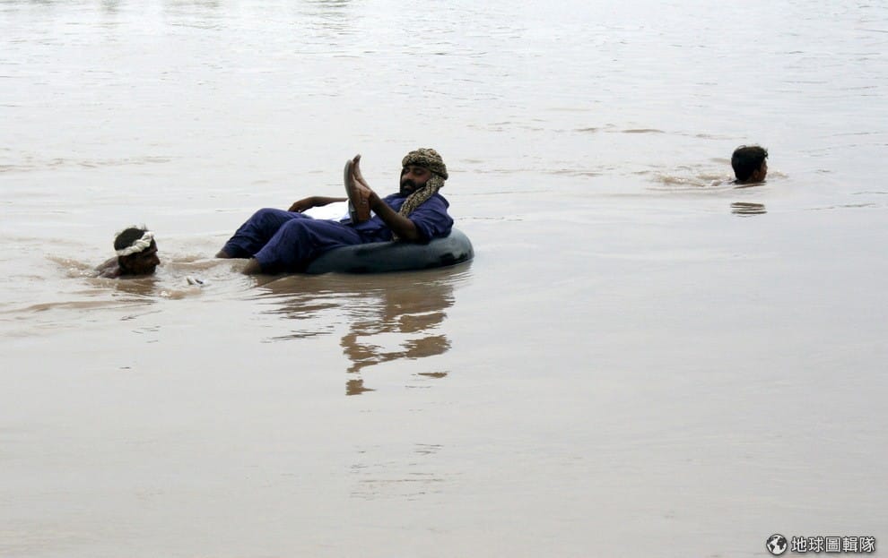 農場工人幫助一名男人渡過河水高漲的奇納布河(Chenab river)。季風帶來的豪雨造成巴基斯坦淹水,使得當地至少有 28人死亡,數十萬人生活受到影響。根據救援組織的說法,接下來幾天當地還會出現暴雨。
