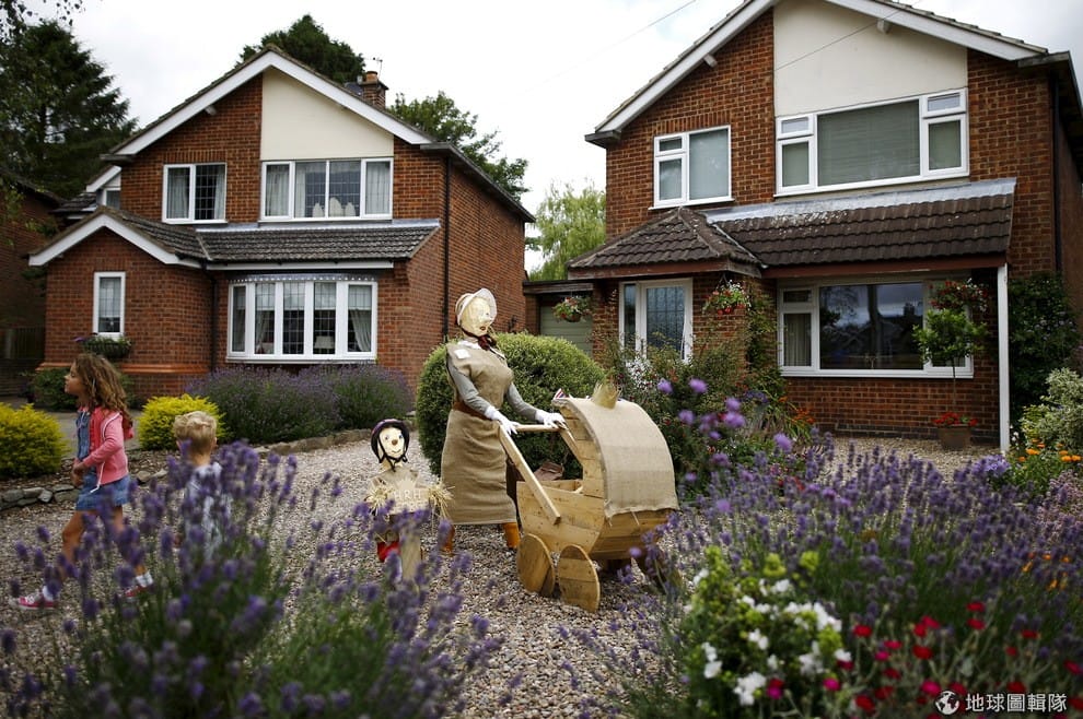 小朋友站在稻草人旁邊,這個稻草人是模仿英國喬治小王子(Prince George)、夏綠蒂小公主(Princess Charlotte)和保母做出來的。英國的希瑟地區(Heather)舉辦稻草人節,請居民們幫忙做稻草人為慈善組織募款。