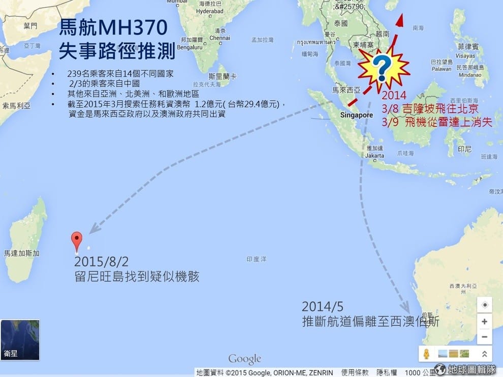2014年 3月8日,載有 239人的馬航MH370班機於凌晨時從吉隆坡起飛,預計當天上午 6點30分降落在北京,但凌晨 2點40分卻在越南上空失聯,直到 9號晚間時,越南官方表示他們在南邊的海面上找到疑似飛機殘骸。