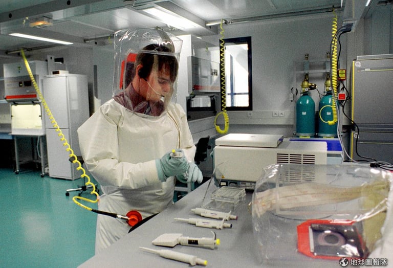 法國里昂的實驗室中,全副武裝的研究人員正在研究伊波拉病毒。