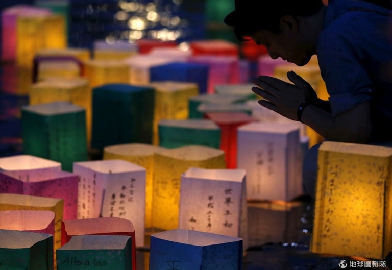 哀悼廣島原爆的民眾將紙燈籠放到面對原爆遺址圓頂屋的河上,雙手合十祈求不要再有戰爭發生。