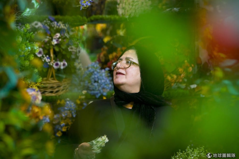 一名伊朗女子在市集中挑選陳列在架上的人造花。
