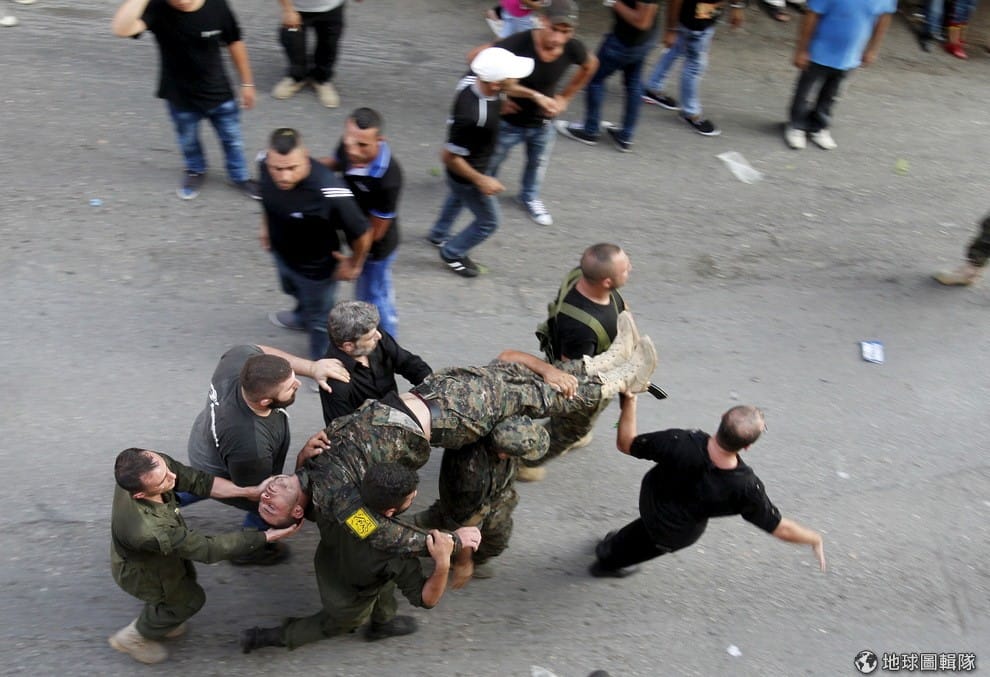 真主黨成員扛著一名昏厥的男子衝向醫院,這名男子在朋友的葬禮上暈倒,他的朋友加入了真主黨,還和支持敘利亞總統阿薩德(Bashar al-Assad)的政府軍一起攻擊反政府軍,不幸在戰爭中身亡。