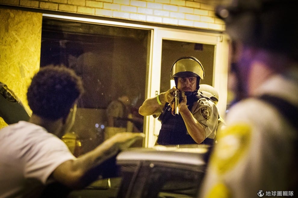 鎮暴警察持槍瞄準抗議民眾並準備逮捕他們。周二(11)這天,密蘇里州佛格森市的大街上充滿悼念黑人青年布朗(Michael Brown)的民眾,布朗在 2014年8月時遭白人警察射殺,民眾在他逝世滿周年這天上街悼念。11號晚間,原本和平的遊行活動突然變得失去控制,許多民眾開始攻擊維安員警,場面一觸即發。去年,黑人青年布朗遭白人警察射殺再次喚起美國黑白種族對立還有警察濫權的問題。