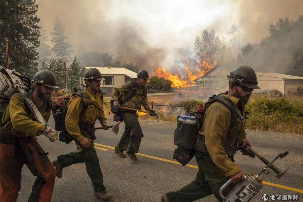 華盛頓州當地,消防隊員和掌鏡的攝影師正奮力往外跑,因為後方的森林火勢又再度竄出。