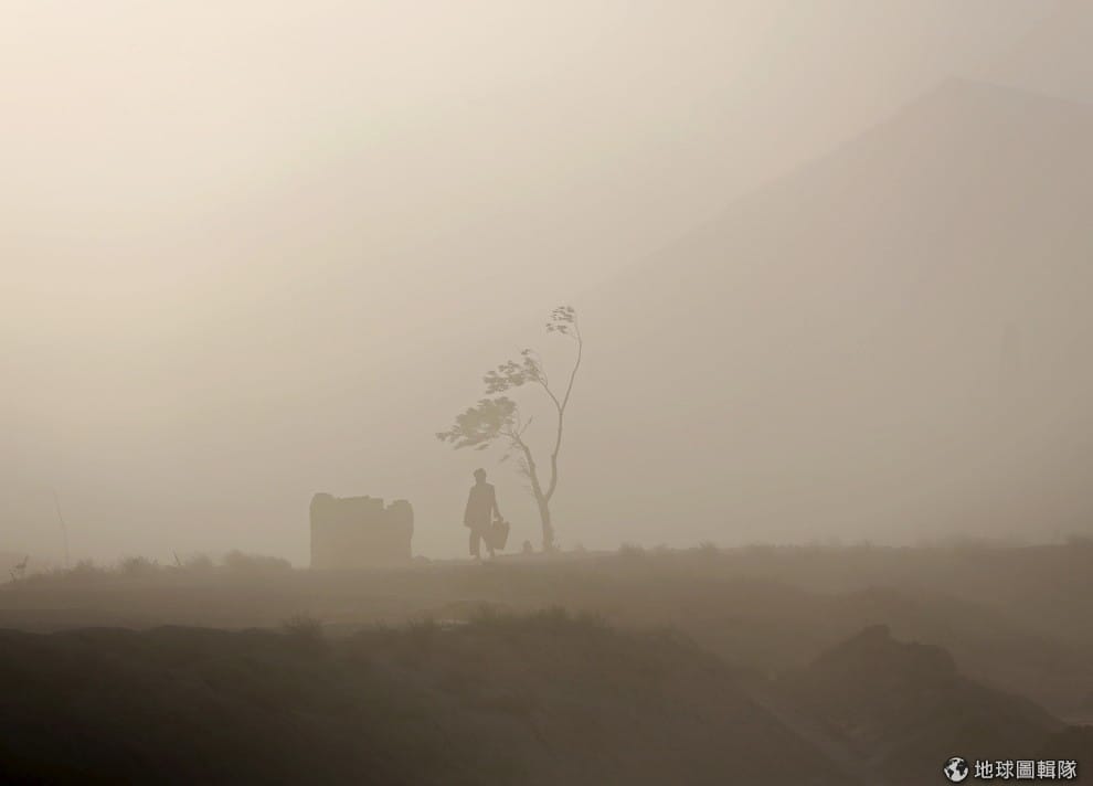 喀布爾當地掀起了漫天沙塵,隱約中仍可以見到民眾走過。