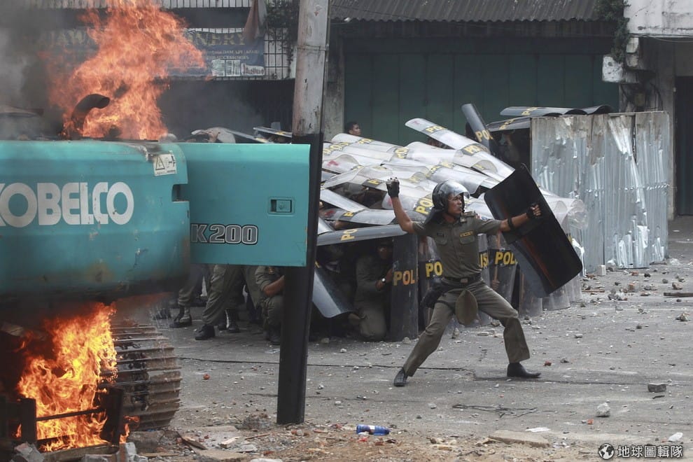 雅加達市區內,警察與抗議被拆遷的把示威者發生衝突,抗議民眾主要來自印尼坎普地區(Kampung Pulo)的吉利翁河(Ciliwung River)河畔,雅加達省長日前宣布因為河畔常常有淹水情況,決定要把河畔旁占據公有用地的非法住宅拆掉,引發居住在此的民眾不滿。