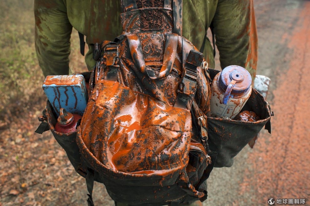 打火消防員的背包上滿是飛機灑下的防燃劑。近日美國俄勒岡州、華盛頓州、愛達荷州和加州陸續傳出森林大火,加上乾燥的天氣影響,讓火勢無法完全撲滅。大火讓鄰近地區的數千戶居民生活受影響,被迫搬離家園。