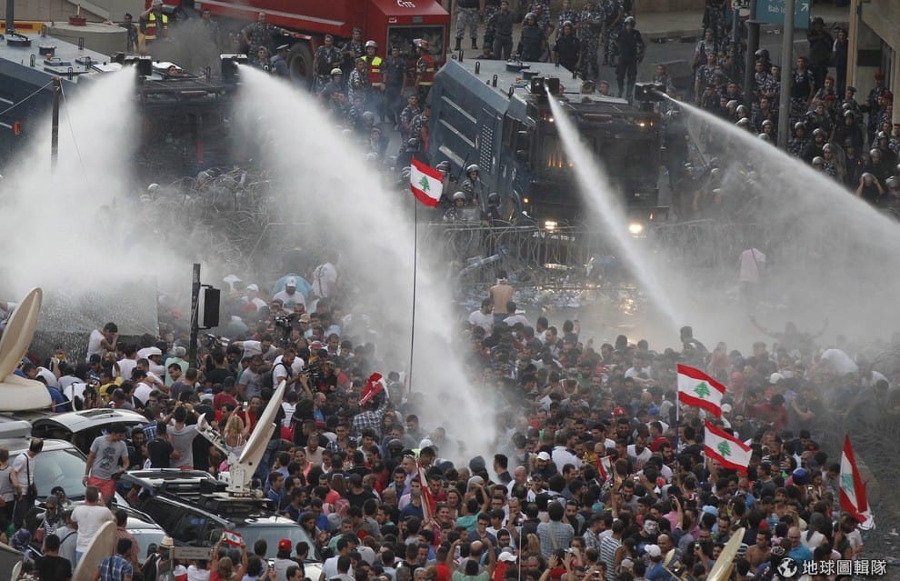 首都貝魯特市區內,可以見到警方朝抗議民眾噴灑水柱。黎巴嫩人從 21號開始發動「你很臭」(You Stink)反政府示威遊行,他們不滿政府無力處理政治僵局、貪污不斷以及基礎建設無人管,遂而上街頭抗議,大喊政府快給個交代。
