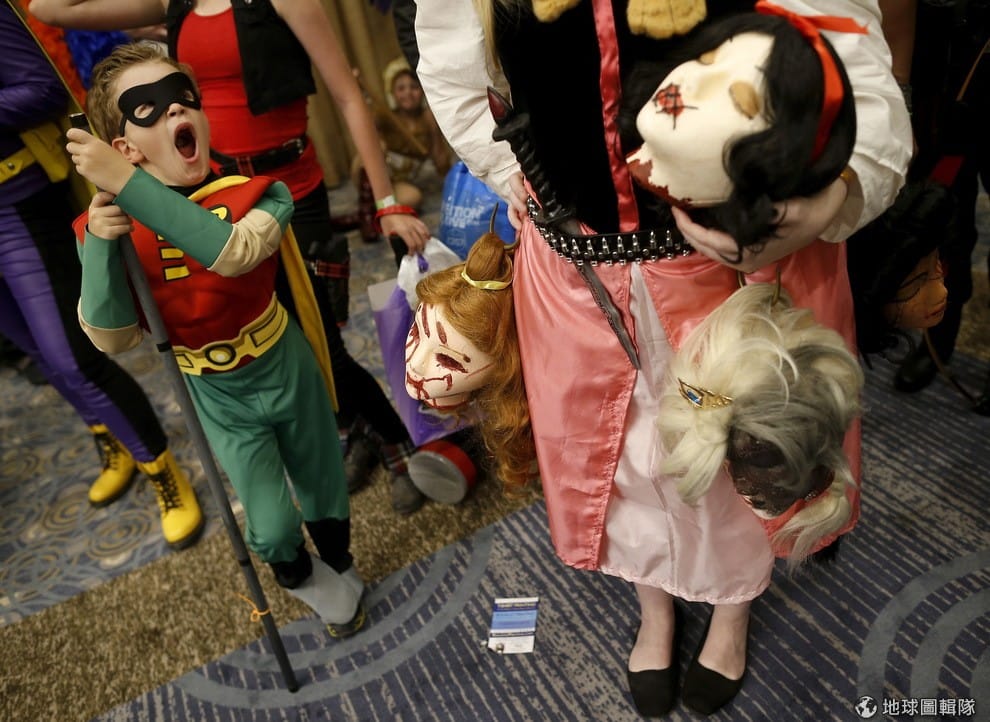 芝加哥市區內,打扮成「羅賓」的小男生與大人們正等待動漫盛會「巫師世界同人展」(Wizard World Comic Con)開幕。