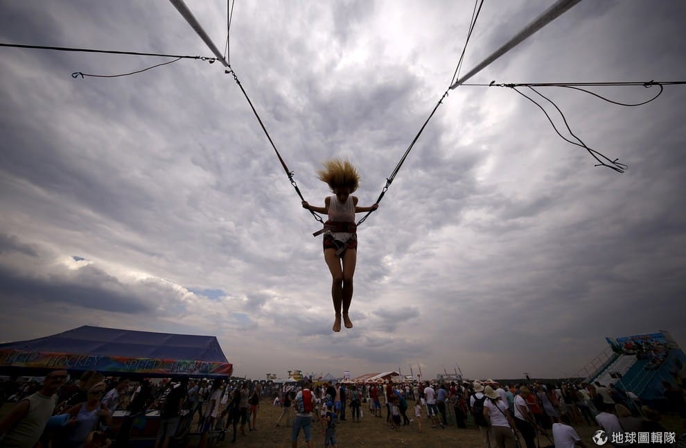 拉多姆(Radom)市內正舉辦空軍展,一名女性遊客正在體驗極限彈簧床。