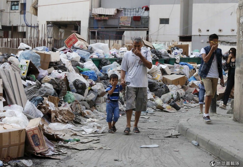 首都貝魯特市區內,民眾掩鼻走過快跟人一樣高的垃圾山。 21號開始,黎巴嫩人從開始發動「你很臭」(You Stink)反政府示威遊行,他們不滿政府無力處理政治僵局、貪污不斷以及基礎建設無人管,遂而上街抗議,大喊政府快給個交代。