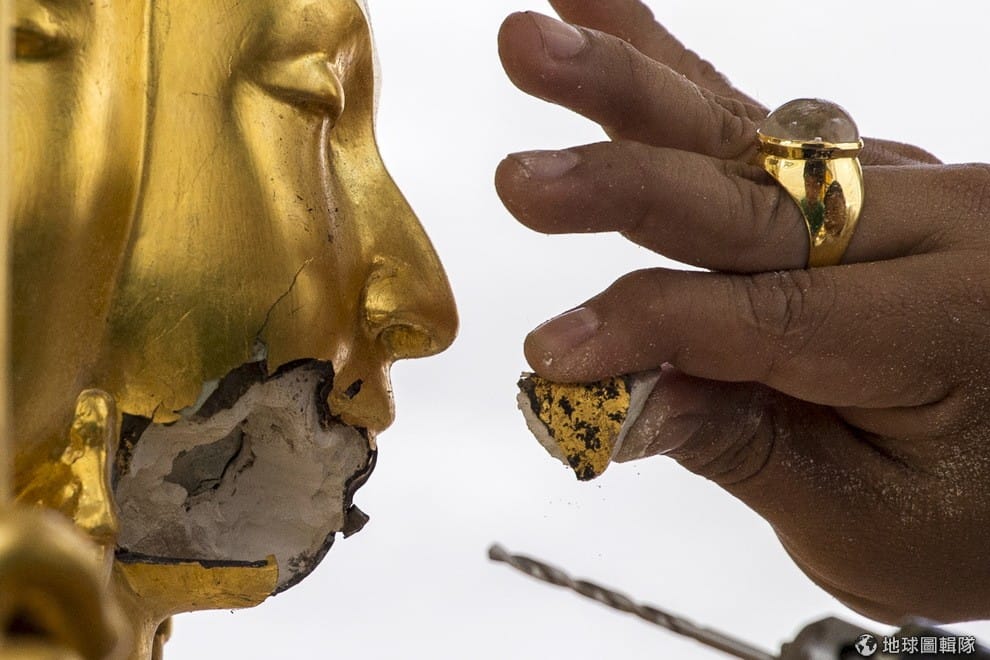 工匠正聚精會神地把受傷的佛像修復。 8月17泰國曼谷市區傳出爆炸案,第一波爆炸地點就在觀光勝地四面佛寺附近,釀成至少 20人身亡。目前泰國警方持續追查嫌犯,並調查可能曾與嫌犯接觸過的民眾。