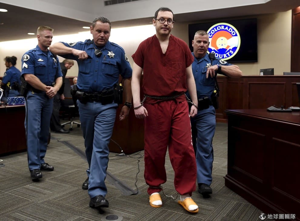 照片中的身穿囚服的人犯是在 2012年7月犯下 12人死亡槍案的兇手霍姆斯(James Holmes),26號時科羅拉多州法院宣判他 12個無期徒刑,以及最高刑期 3,318年。