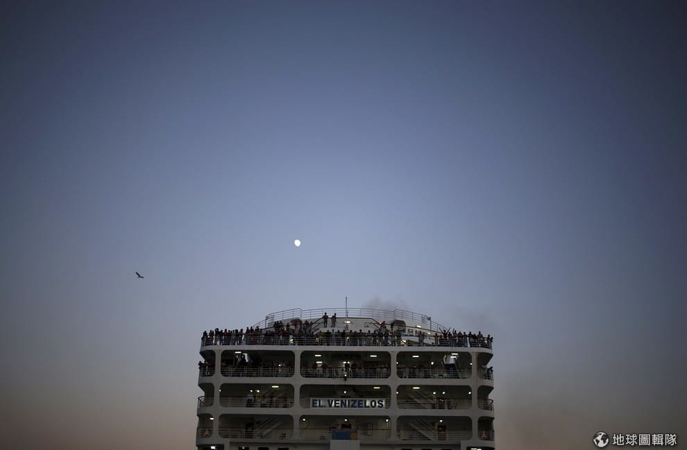 夜色下的「埃萊夫塞里奧斯‧韋尼澤洛斯號」可以見到許多人站在走廊上,他們是來自中東的難民,希望從希臘一路往西歐國家移動。 24號時,希臘政府表示他們國內的建設已經無法容納這龐大的難民潮。