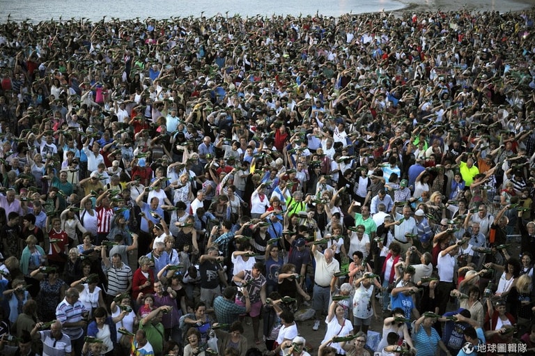 西班牙沿海工業城市希洪(Gijon)可見數千人齊聚,他們想要挑戰金氏世界紀錄,成為最多人同時倒蘋果酒(cider)的新紀錄保持者。 28號這天是希洪當地的年度自然蘋果酒節(Fiesta de la Sidra Natural)。