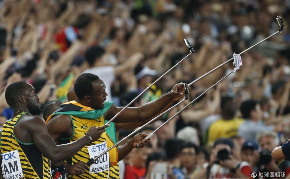 牙買加選手跑贏 4x100公尺男子接力賽冠軍後,興奮拿起手機自拍,這兩名選手分別是阿什梅德(左,Nickel Ashmeade)和波特(右,Usain Bolt),他們在 8月22-30日來到中國參加第 15屆世界田徑錦標賽(IAAF)。