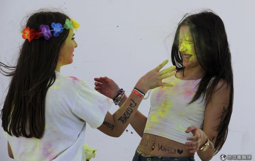 兩名女性互相潑灑彩色的粉末。西班牙北部的阿維萊斯市(Aviles)舉辦色彩派對節,參加的人手上拿著彩粉往彼此的身上潑,色彩派對節的靈感是來自印度的傳統節日色彩節(Holi),這個節日在印度本來是慶祝春天、互相祝福的節日,傳到其他國家之後發展成各類型的活動,像是台灣舉辦過的彩色路跑、彩色派對活動,就是從色彩節發展來的。