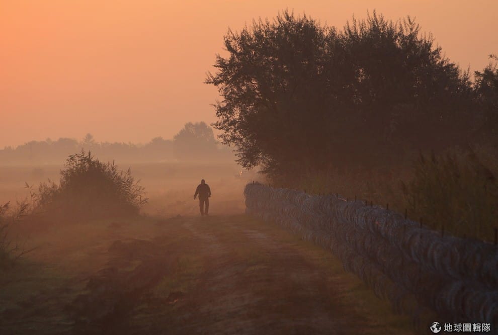 清晨的時候,匈牙利警察在匈牙利和塞爾維亞的邊界巡邏。今年有大約 10萬名來自敘利亞和中東戰亂地區的難民,他們為了逃離戰爭,從希臘前進到馬其頓,再經過塞爾維亞進到匈牙利和其他歐洲國家。因為難民人數實在是太多,頭痛的匈牙利決定在邊界蓋起 4公尺的高牆,阻擋難民進來;另一方面有最新報導指出,馬其頓改變心意決定放行這些難民一路往北,讓在北邊的匈牙利更加緊張。