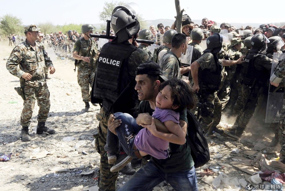 難民抱著小女孩進到馬其頓國內。今年有大約 10萬名來自敘利亞和中東戰亂地區的難民,他們為了逃離戰爭,從希臘前進到馬其頓,再經過塞爾維亞進到匈牙利和其他歐洲國家。