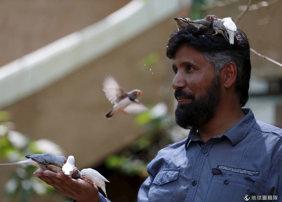 數隻鳥兒站在賽拜(Abdulrahman al-Sebai)的頭上,賽拜因為自己的興趣,在農場裡養了超過 500隻鳥。