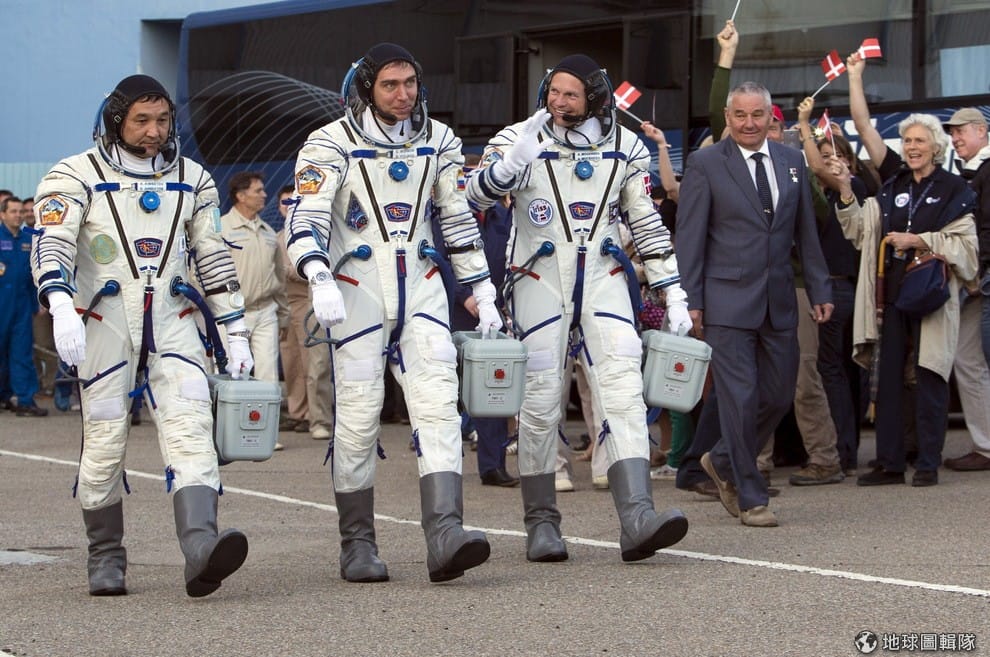 周三(2)這天,太空人安比托(左1,Aidyn Aimbetov)、維科弗(左2,Sergei Volkov)以及丹麥首位太空人莫根森(Andreas Mogensen)搭著俄國聯合號火箭(Soyuz rocket)從哈薩克出發,到國際太空站執行任務。